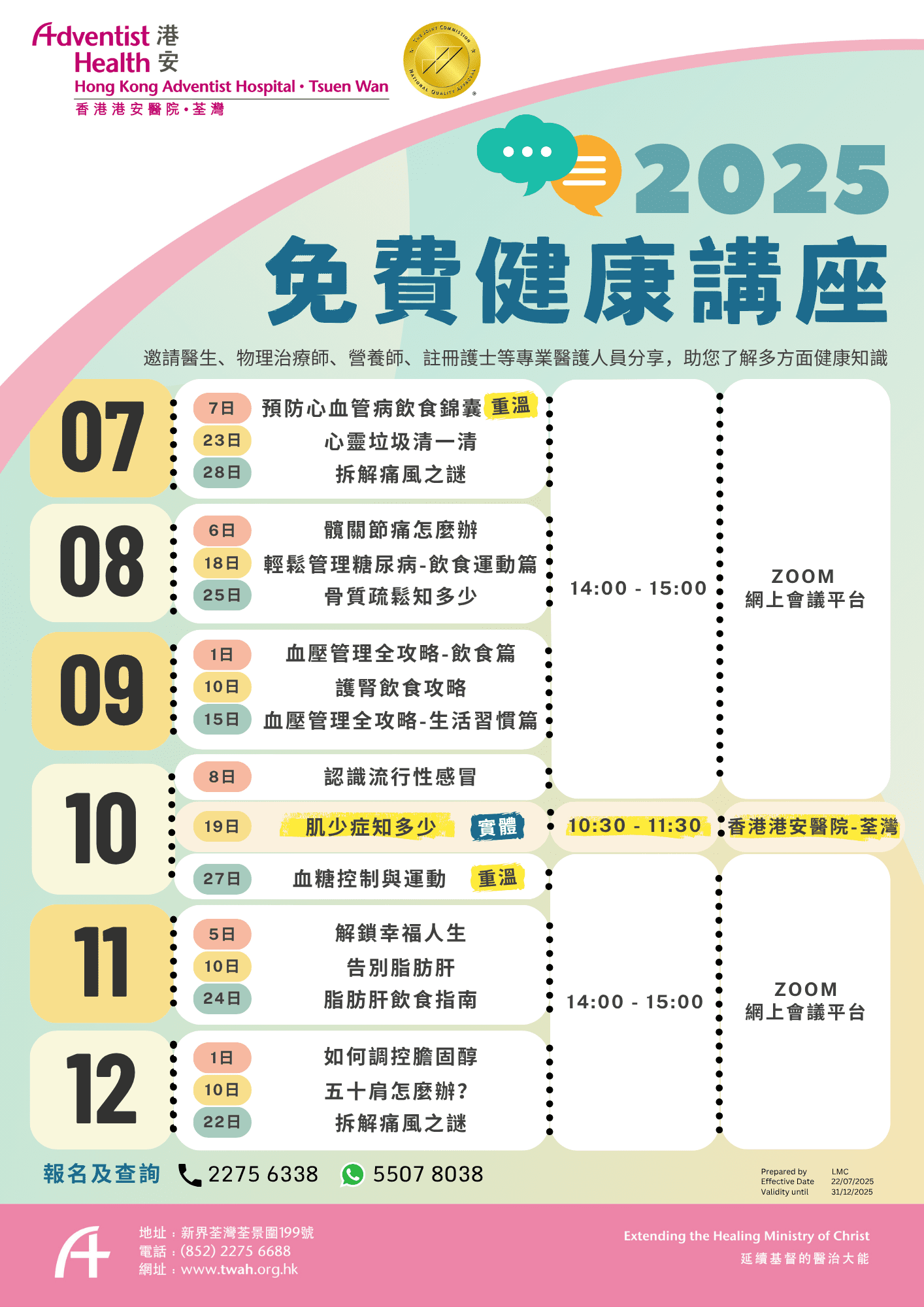 荃灣港安健康生活促進中心邀請醫生、物理治療師、營養師、註冊護士等不同的專業醫護人員分享,幫助您了解多方面健康知識。