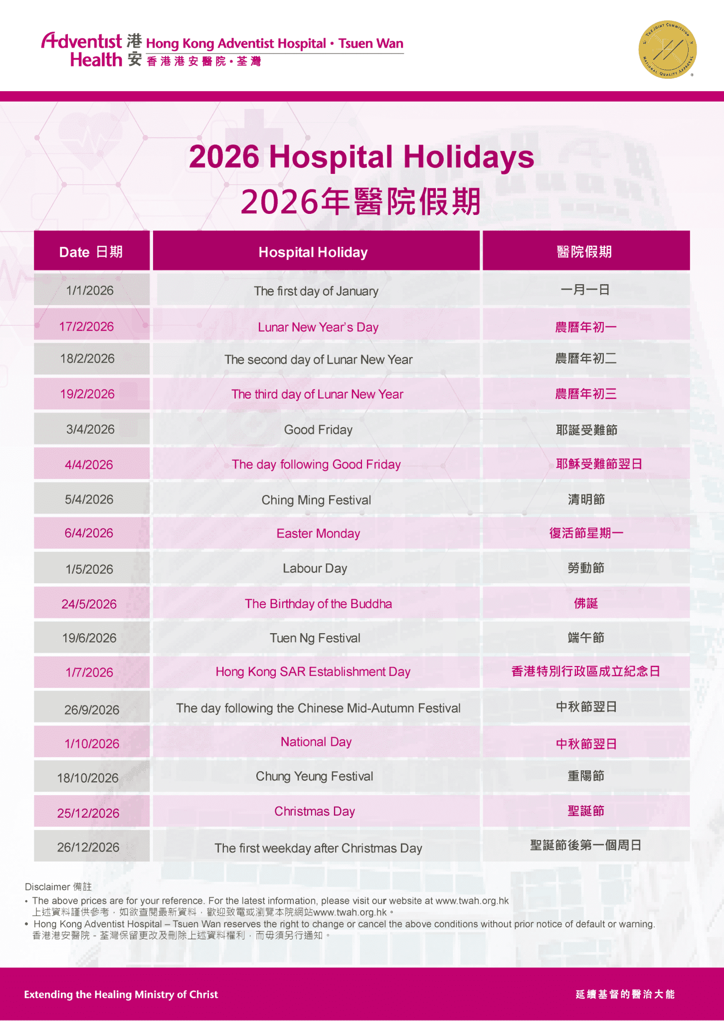 Hong Kong Adventist Hospital - Tsuen Wan is dedicated to providing comprehensive care and outpatient services and 24-hour emergency services year-round to patients in need.