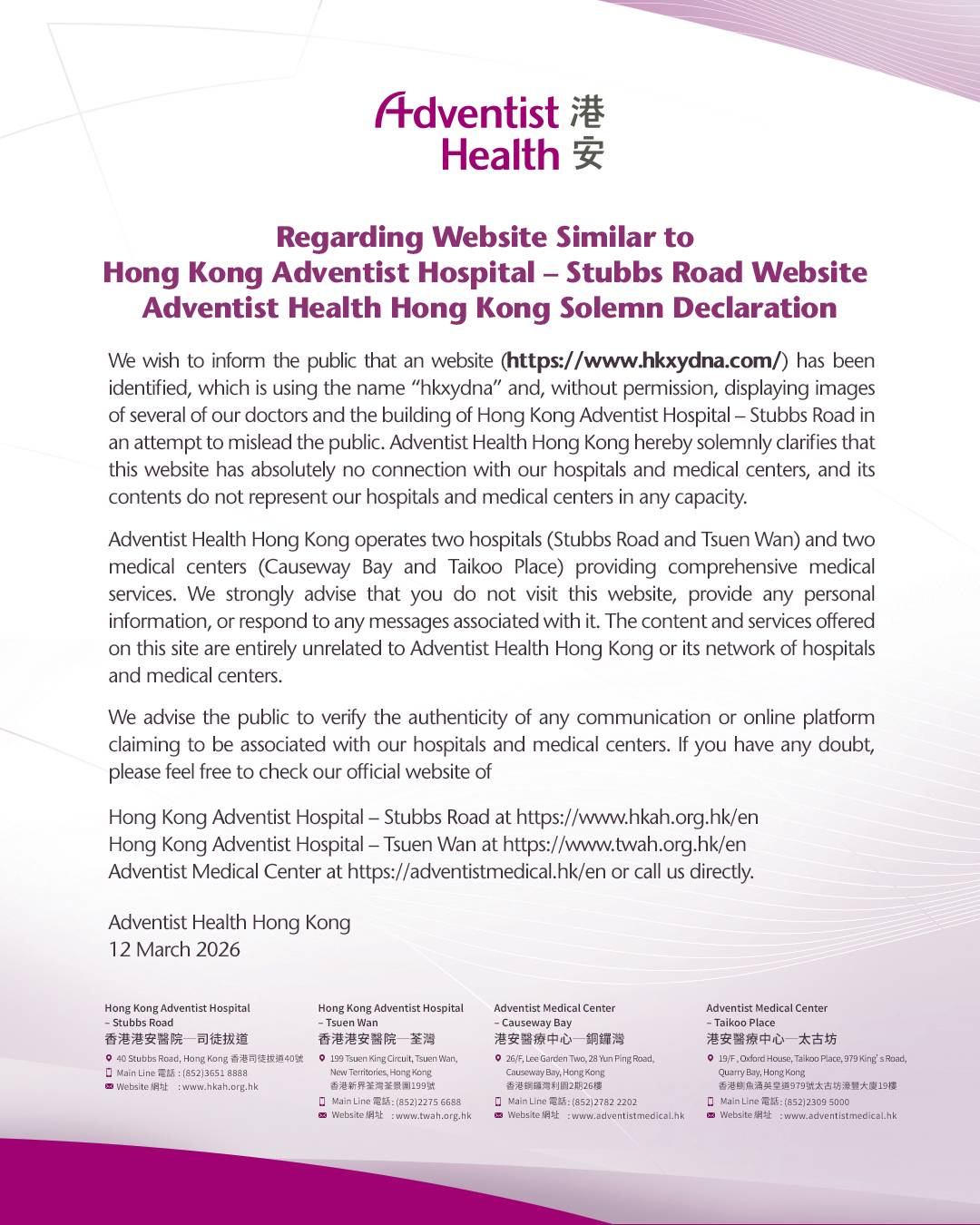 [Declaration] Regarding Website Similar to Hong Kong Adventist Hospital – Stubbs Road Website Adventist Health Hong Kong Solemn Declaration